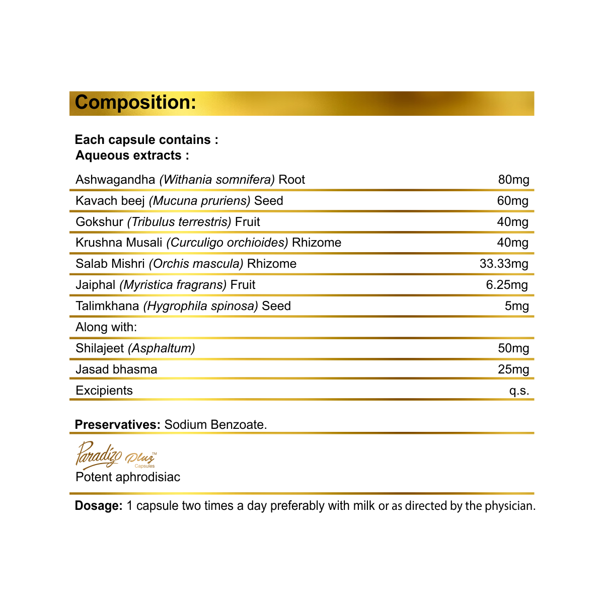 - The potent antioxidants in Paradizo pluz like Ashwagandha and Gokshura. Thus, Paradizo plus Capsule is extremely beneficial for male sexual health by providing strength to the entire male reproductive system. It is free from any adverse effects especially related to the cardiovascular system as usually seen with modern stimulant drugs.