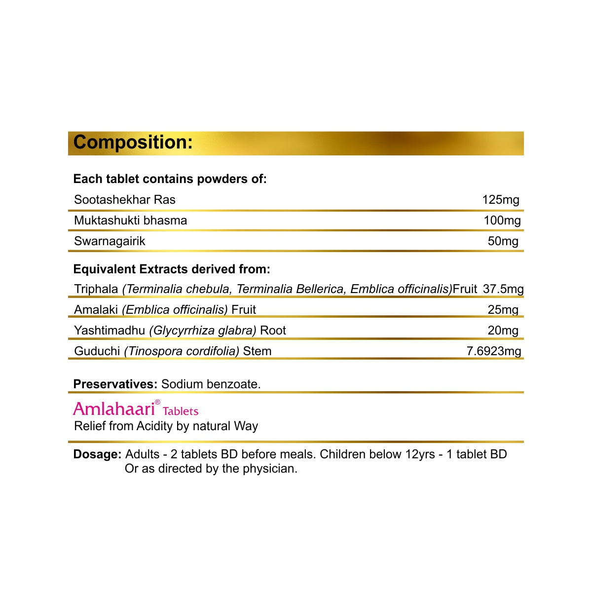 - Amlahaari Tablet is an ayurvedic medicine for relief in conditions of hyperacidity, heartburn, gastro-oesophageal reflux, abdominal distension and gastritis. It has mucosal anti-inflammatory and anti-ulcer activity.