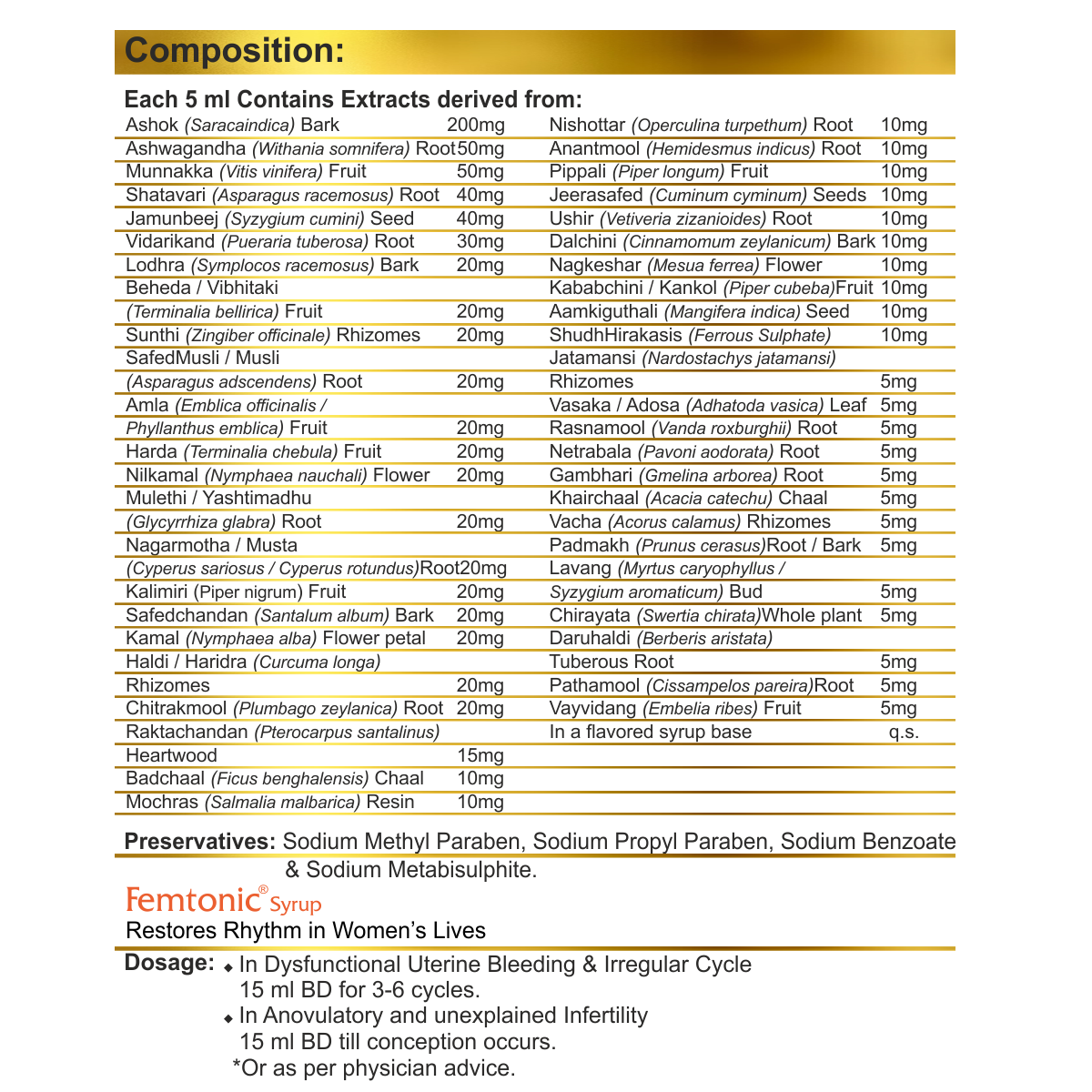 FEMTONIC SYRUP reduces the frequency and intensity of uterine contractions and controls untimely and excessive uterine bleeding. It also ensures endometrial integrity.