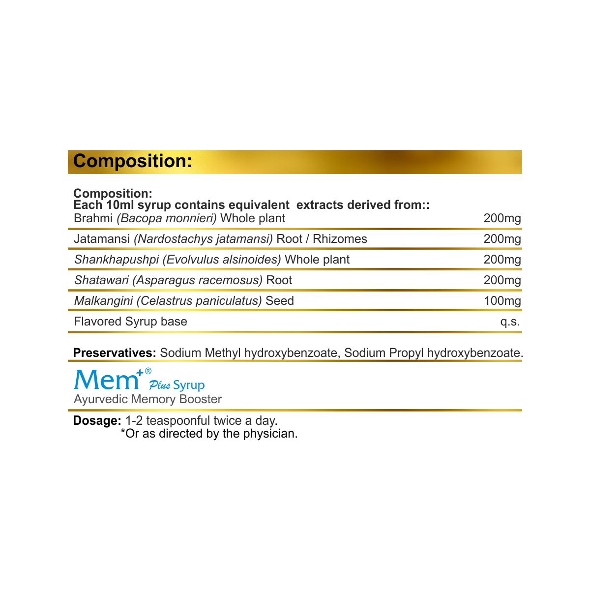 - MEM+ PLUS SYRUP is an Ayurvedic memory-booster.
