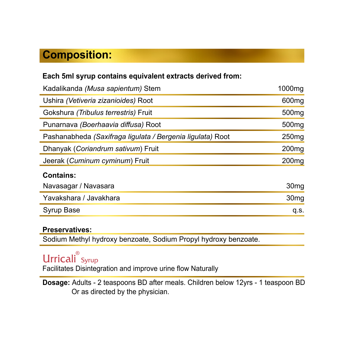- URRICALI SYRUP helps to facilitate the disintegration or break down of urinary stones and improves urine flow naturally.